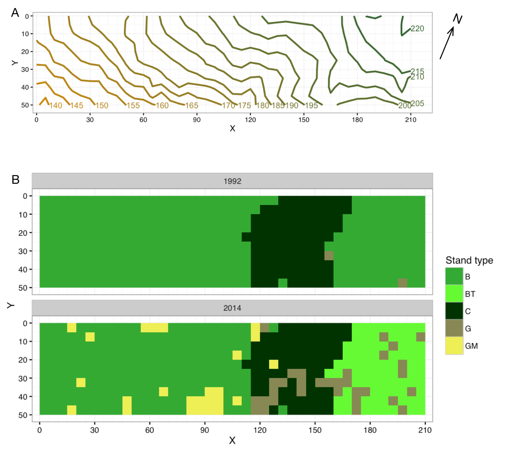 調査地の概要を 図 1 にしめします。Aは等高線を、Bは1993年と2014年の林相をしめしています。Bの林相の記号は以下のとおりです。