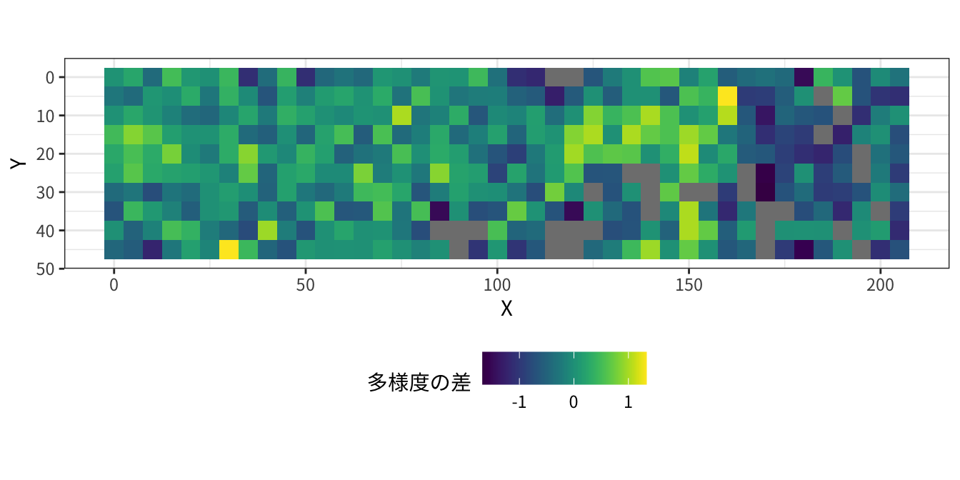 scale_fill_continuous(name = "多様度の差", palette = "viridis") +