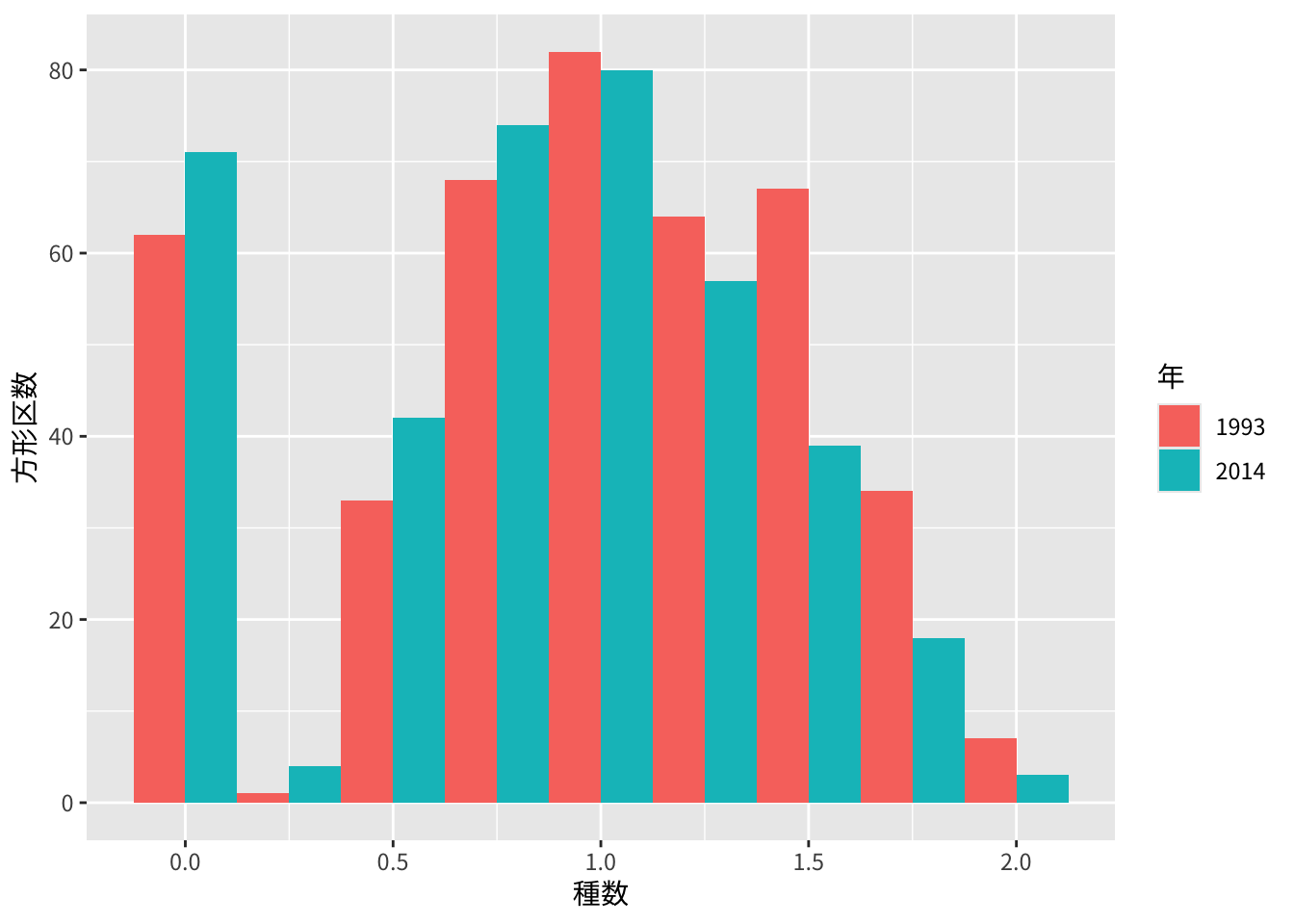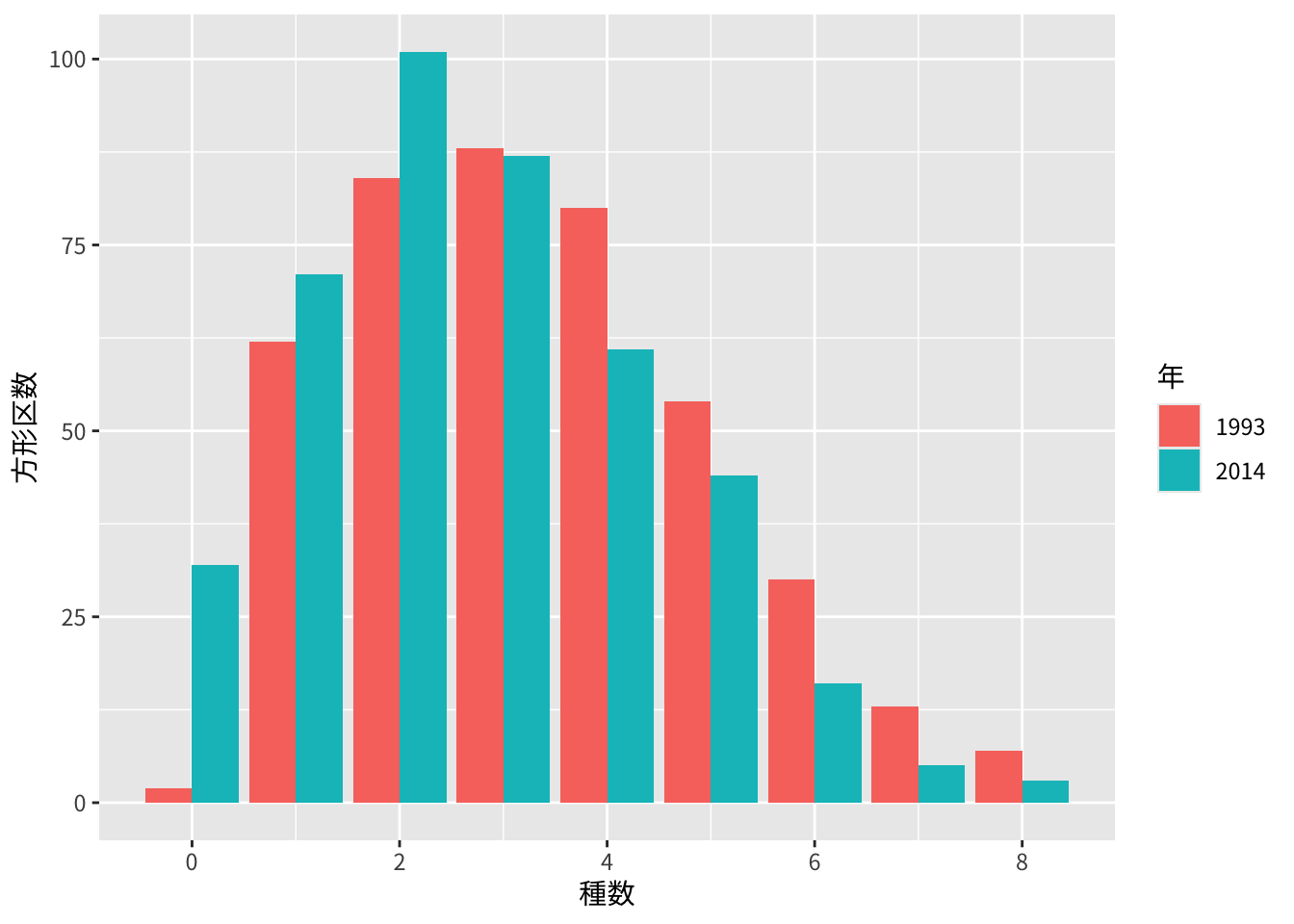 そこで、1993年と2014年の測定結果間で、樹種の多様度がどのように変化したのかを検討します。