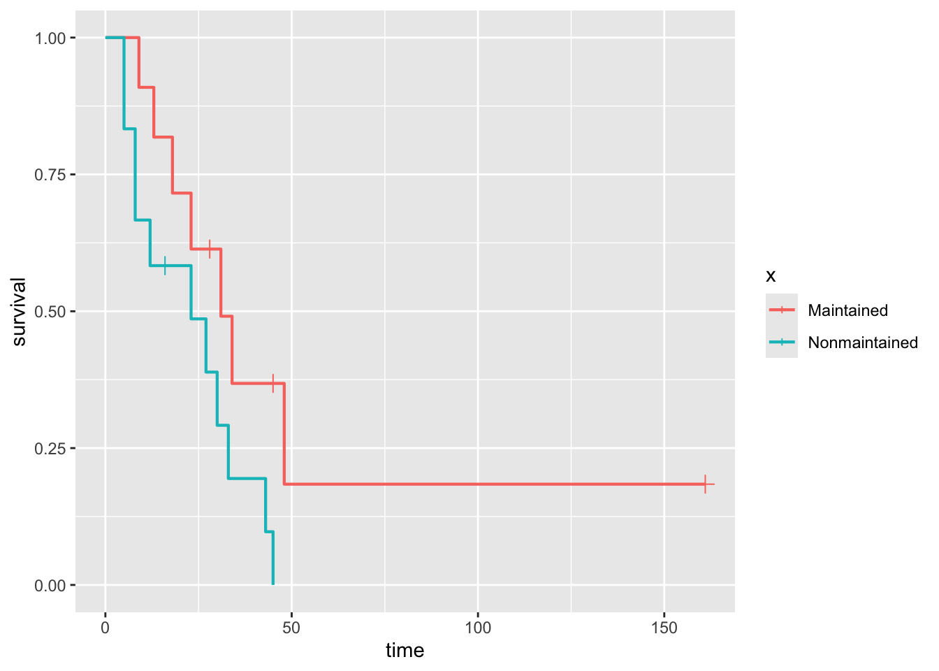 ggplot(aml, aes(time = time, status = status, color = x)) +