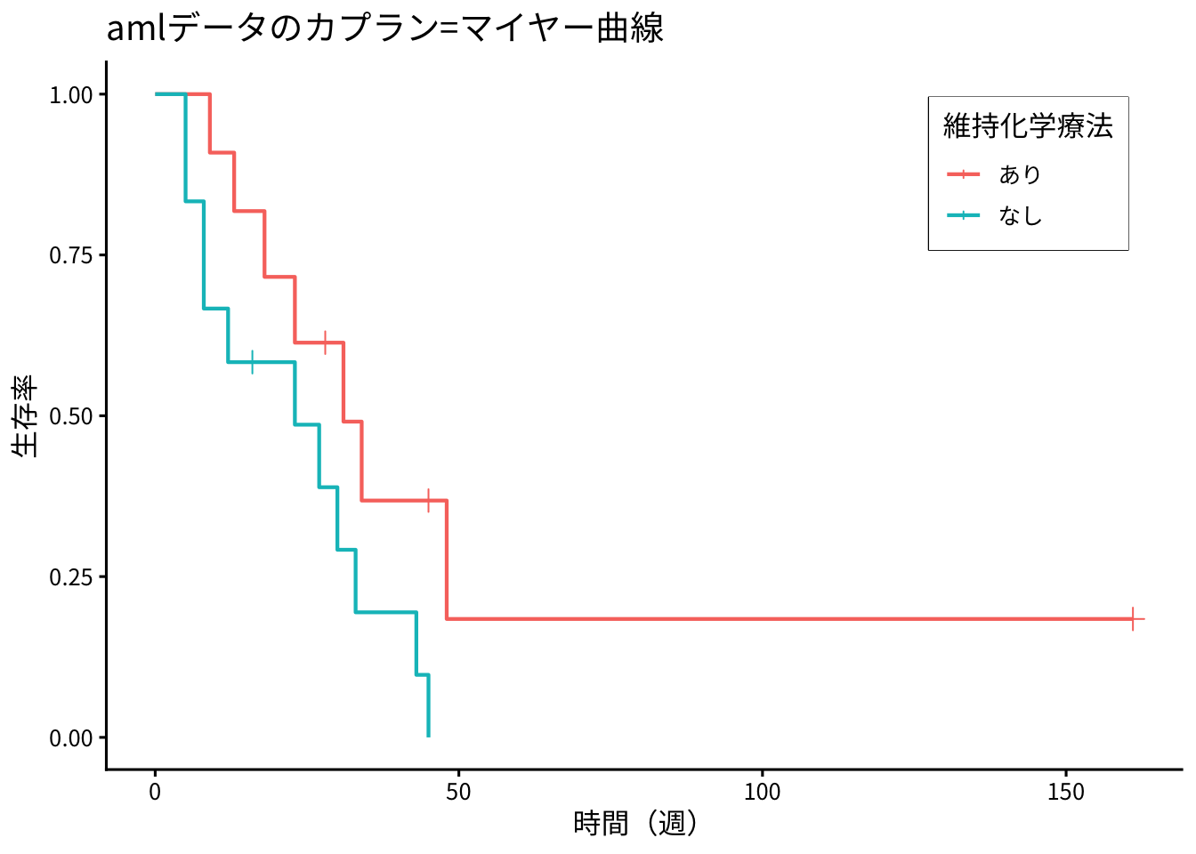 labs(title = "amlデータのカプラン=マイヤー曲線",