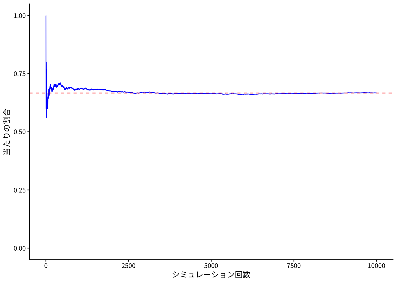labs(x = "シミュレーション回数", y = "当たりの割合") +