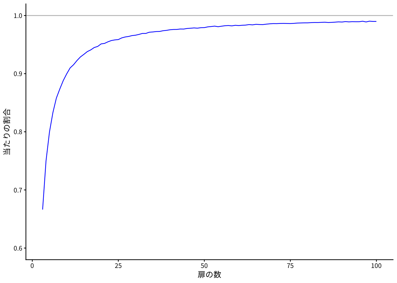 n を 3, 4,.., 100と変化させ、r は n-2 としたときの当たりの割合をグラフで表示します。