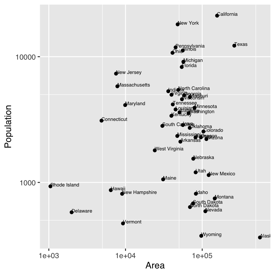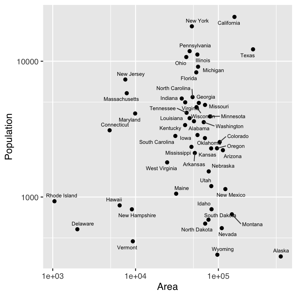 まずは、通常のgeom_textで州名を点の横に表示するようにします。